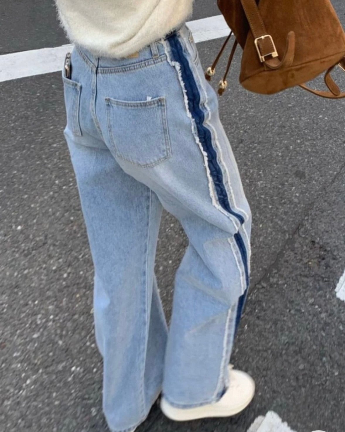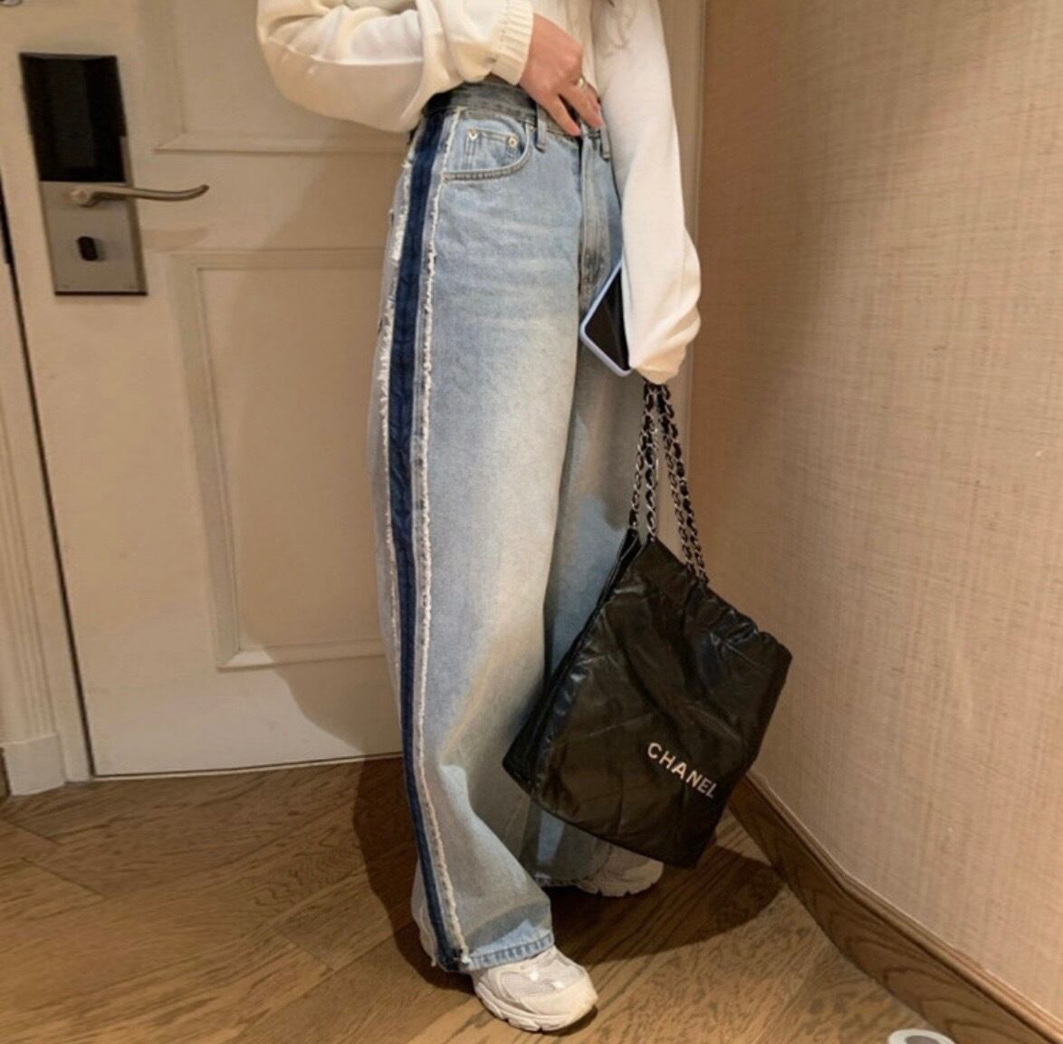 両サイドに濃淡の違うデニムをドッキング。縦ラインが強調されて、脚がまっすぐ&長く見える。