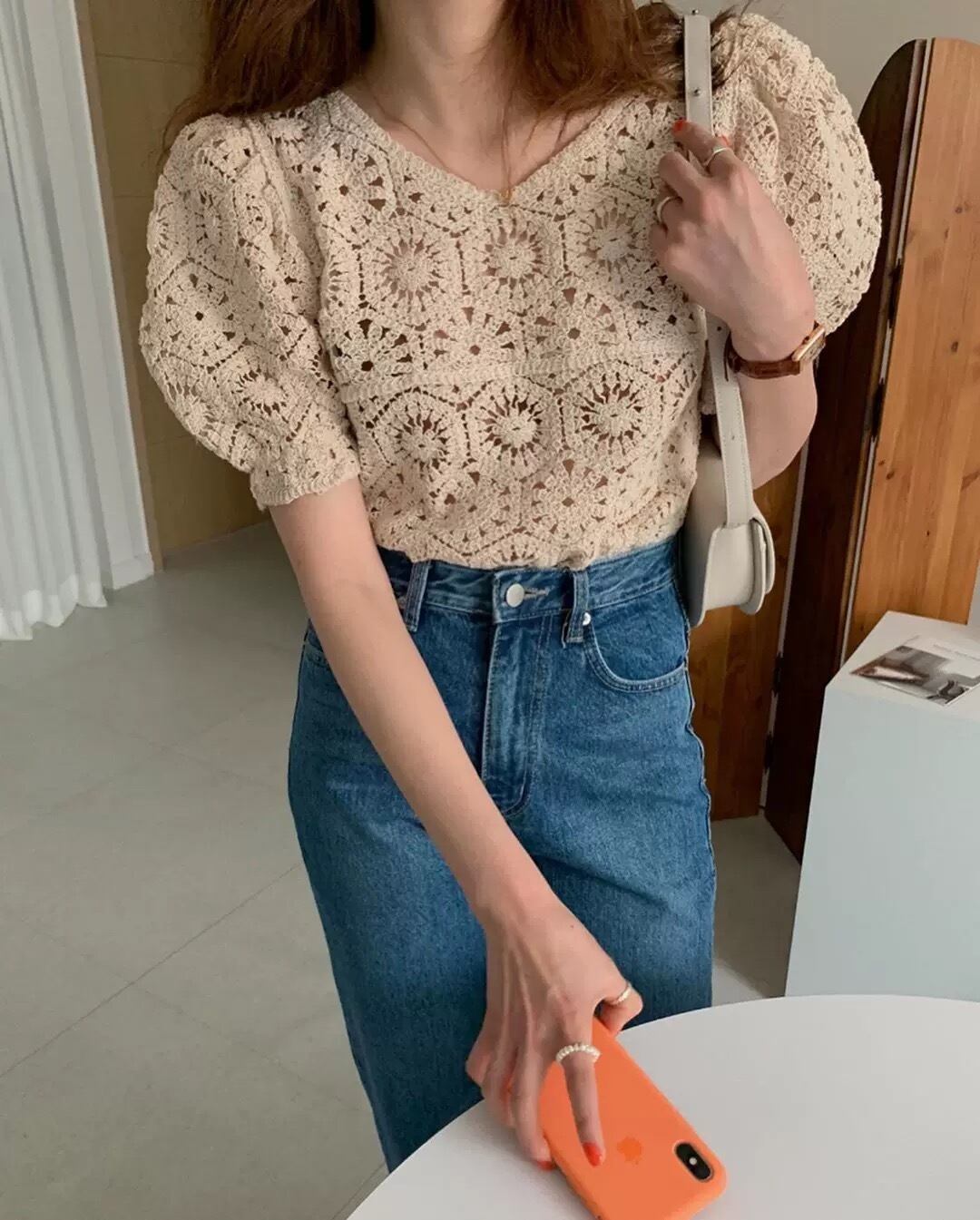 手編み風の立体感あるレースで、ナチュラル&フェミニンな印象。透け感があり涼しげ。
