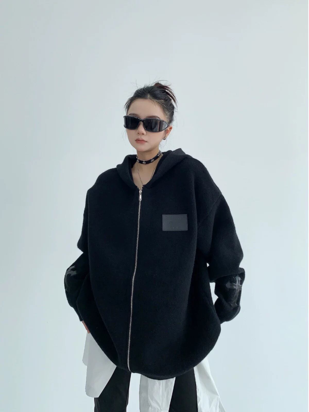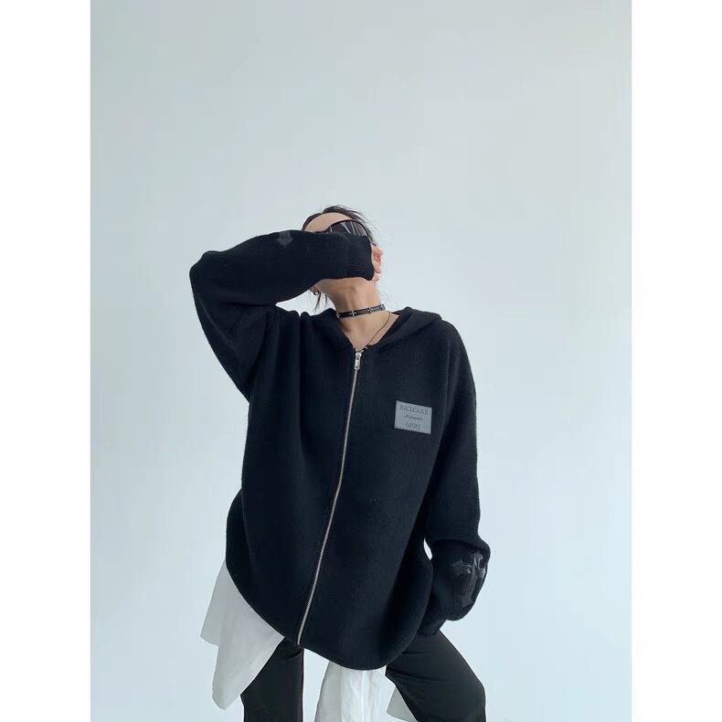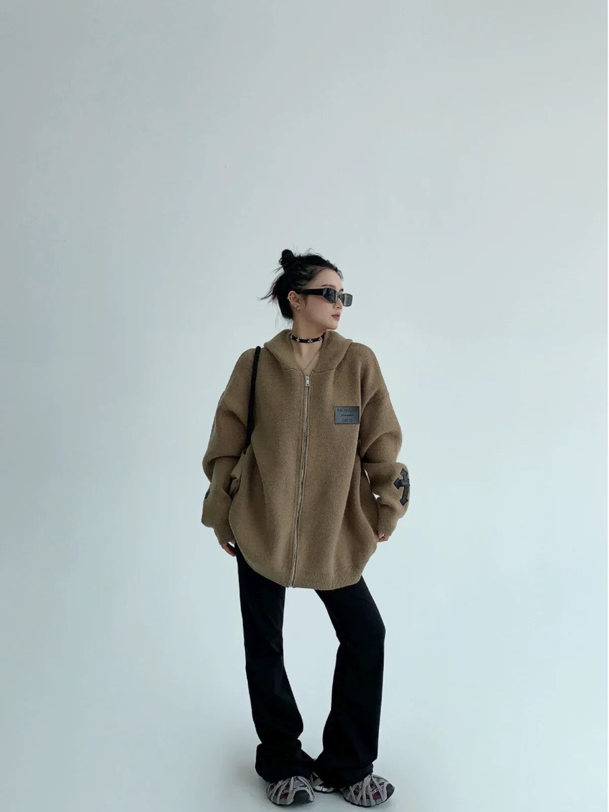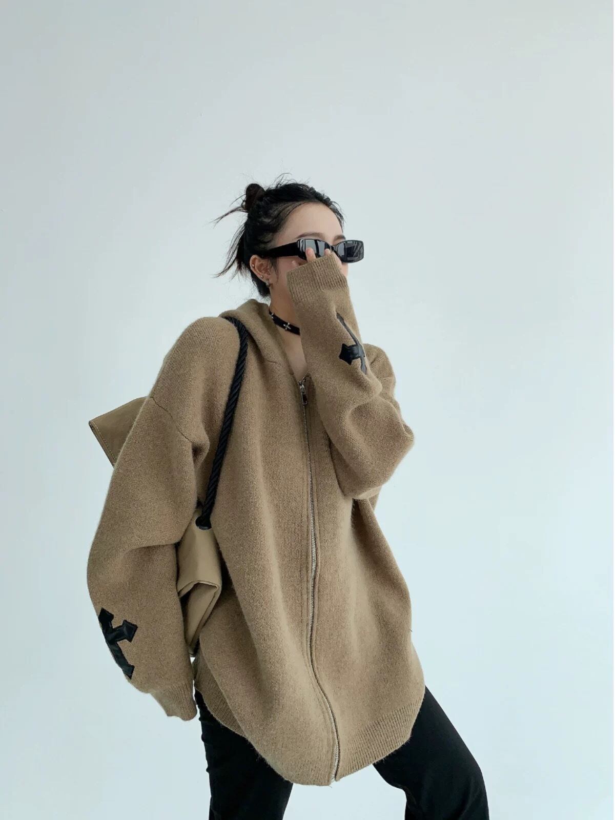 【OISIS】オーバーサイズニットジップアップパーカーは、ユニセックスデザインが魅力の一着です!キャメル、ダークグレー、ブラックの3色展開で、スタイリングの幅を広げるアイテムです。袖のクロスデザインが特徴的で、トレンド感を演出しつつ、胸元のレザーワッペンが洗練された印象を与えます。暖かいニット素材を使用しているため、快適さを重視したコーディネートが可能です。カジュアルシーンやリラックスタイムにぴったりで、長期間愛用できる高い汎用性◎