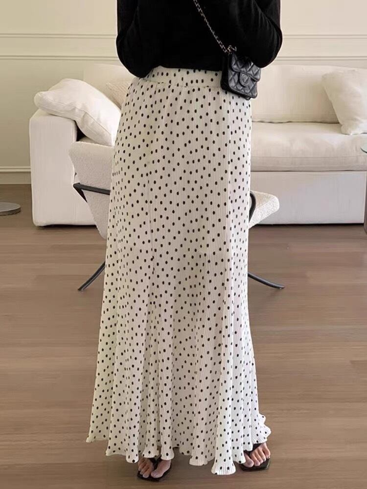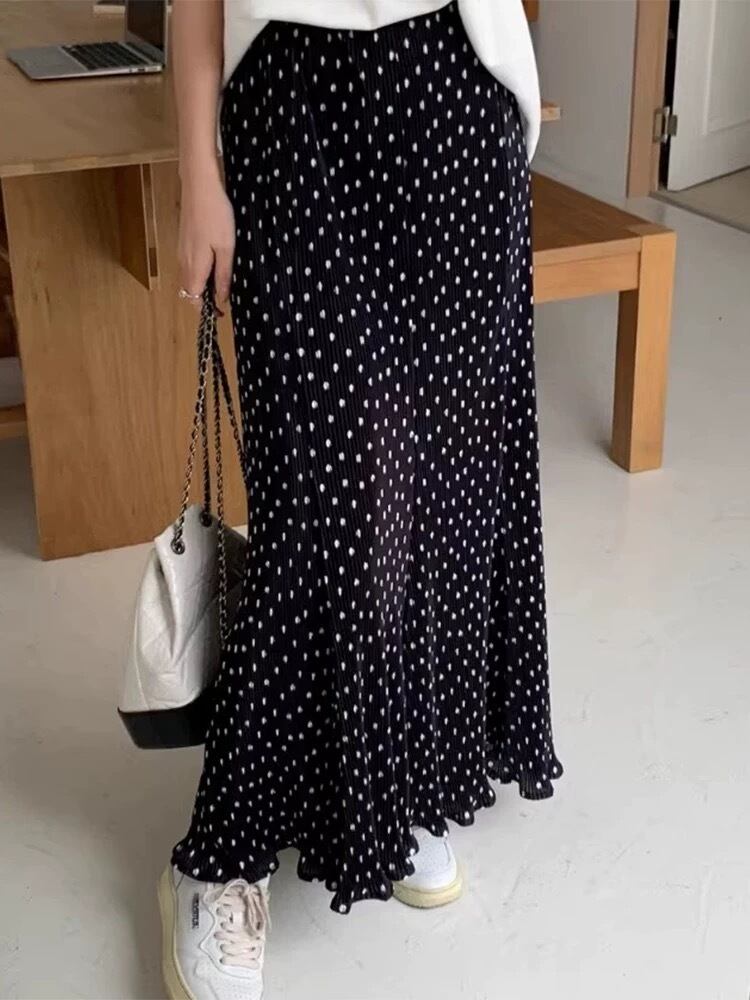 かわいさと上品さの両方を感じるクラシックな水玉模様のロングスカート。