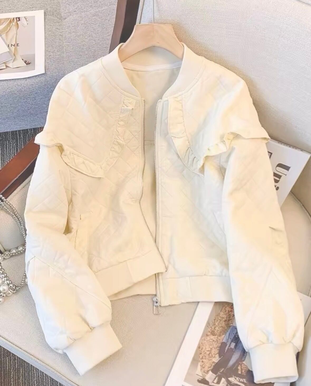 柔らかなアイボリーカラーに、立体感のあるキルティング素材が高見えする一枚です。