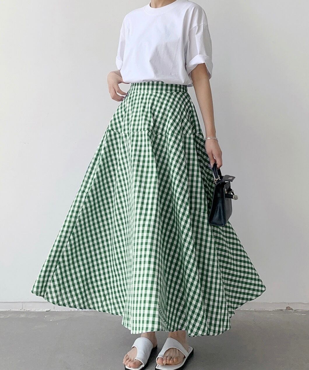 ふんわりと広がるシルエットが魅力の、ギンガムチェックロングスカート。